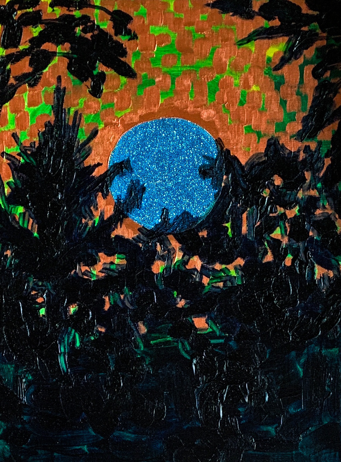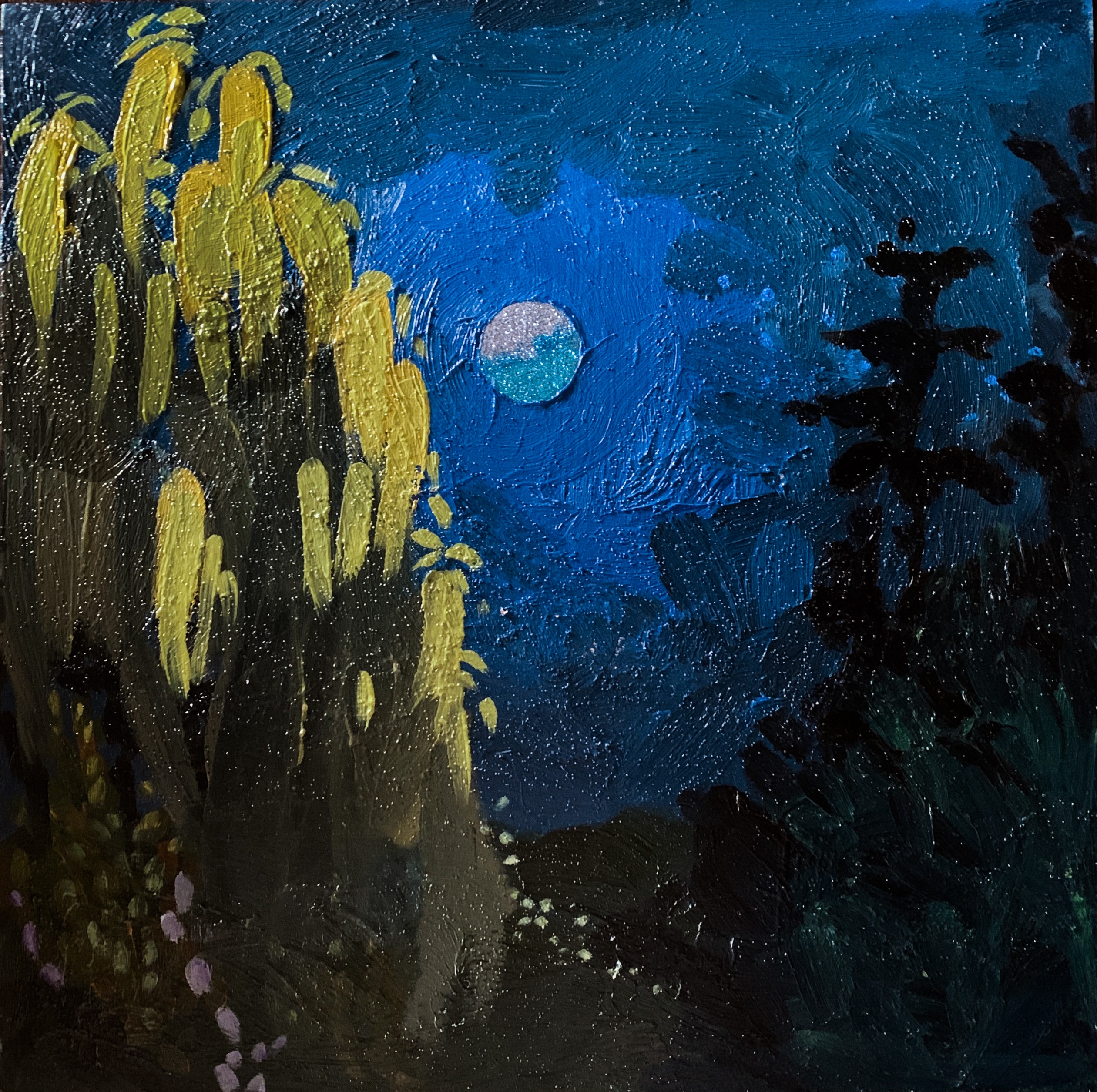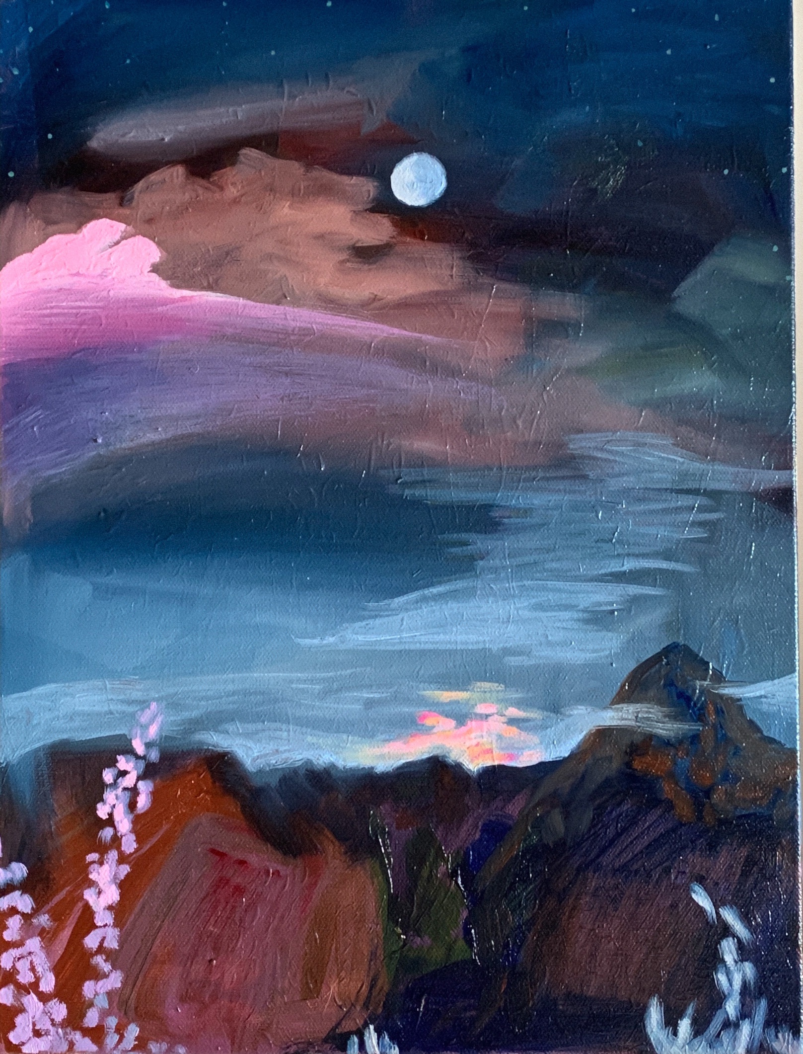 A large painting I made a few years ago called Desert Moon. I wanted to paint a similar composition, a full moon centered in a vast sky. I like the way the composition makes you feel like the moon is there for only you.